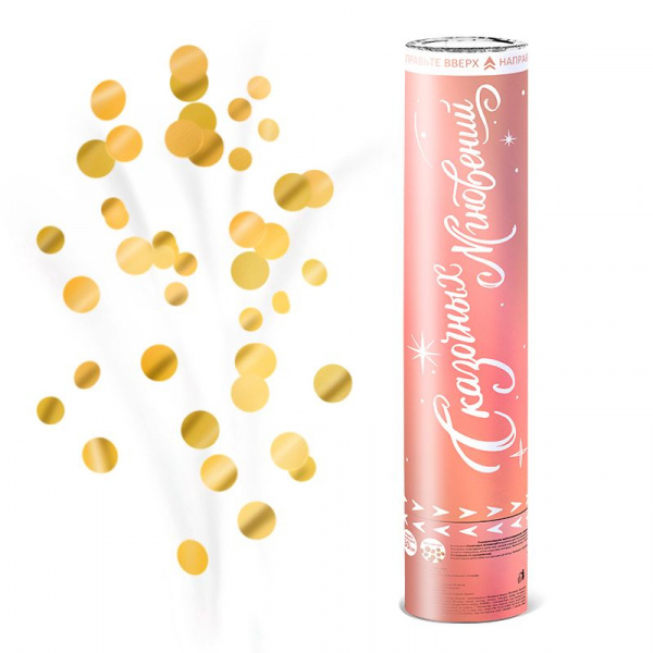 Наполнитель – золотые круглые конфетти. Перед использованием встряхните хлопушку.